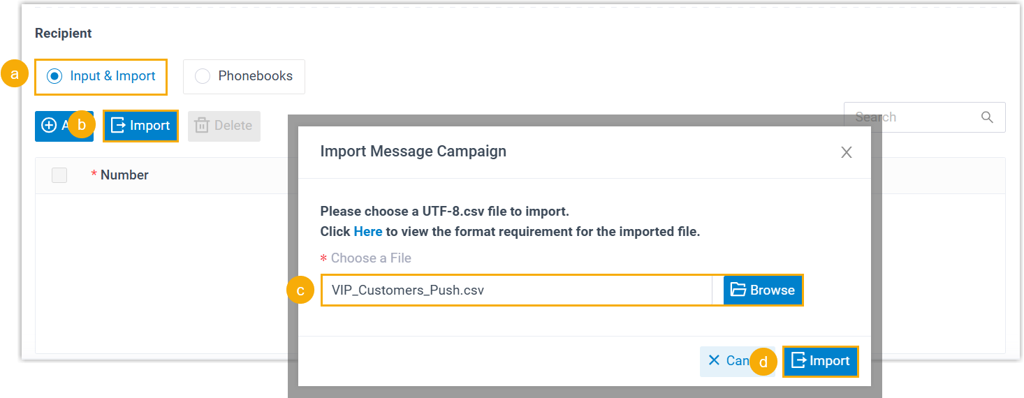 Import from CSV file Import a CSV file containing the contacts’ phone numbers.