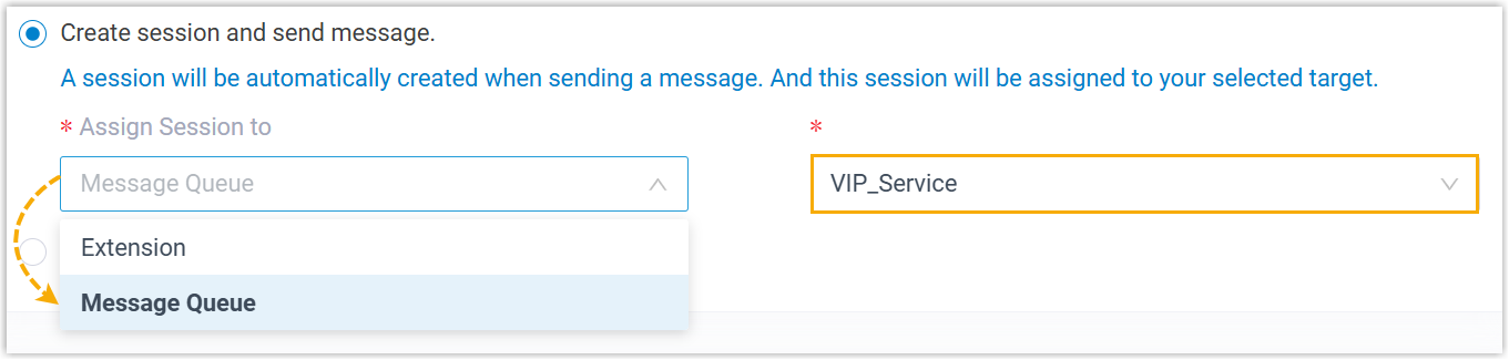Option Description Create session and send message The system automatically create a session for each contact number when sending the campaign messages, and the sessions will be assigned to a selected target (either an extension or a message queue). Note: If an active session already exists for a contact number, the campaign message will be sent to the existing session instead of creating and assigning a new session to the specified target.