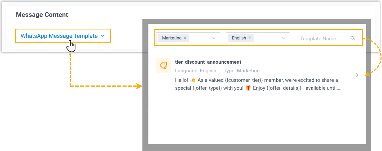 WhatsApp campaigns allows you to send marketing, utility, and authentication messages directly to your contacts' mobile devices via WhatsApp using message templates, making it easy to reach customers quickly and effectively. This topic describes how to create a message campaign for a WhatsApp channel.