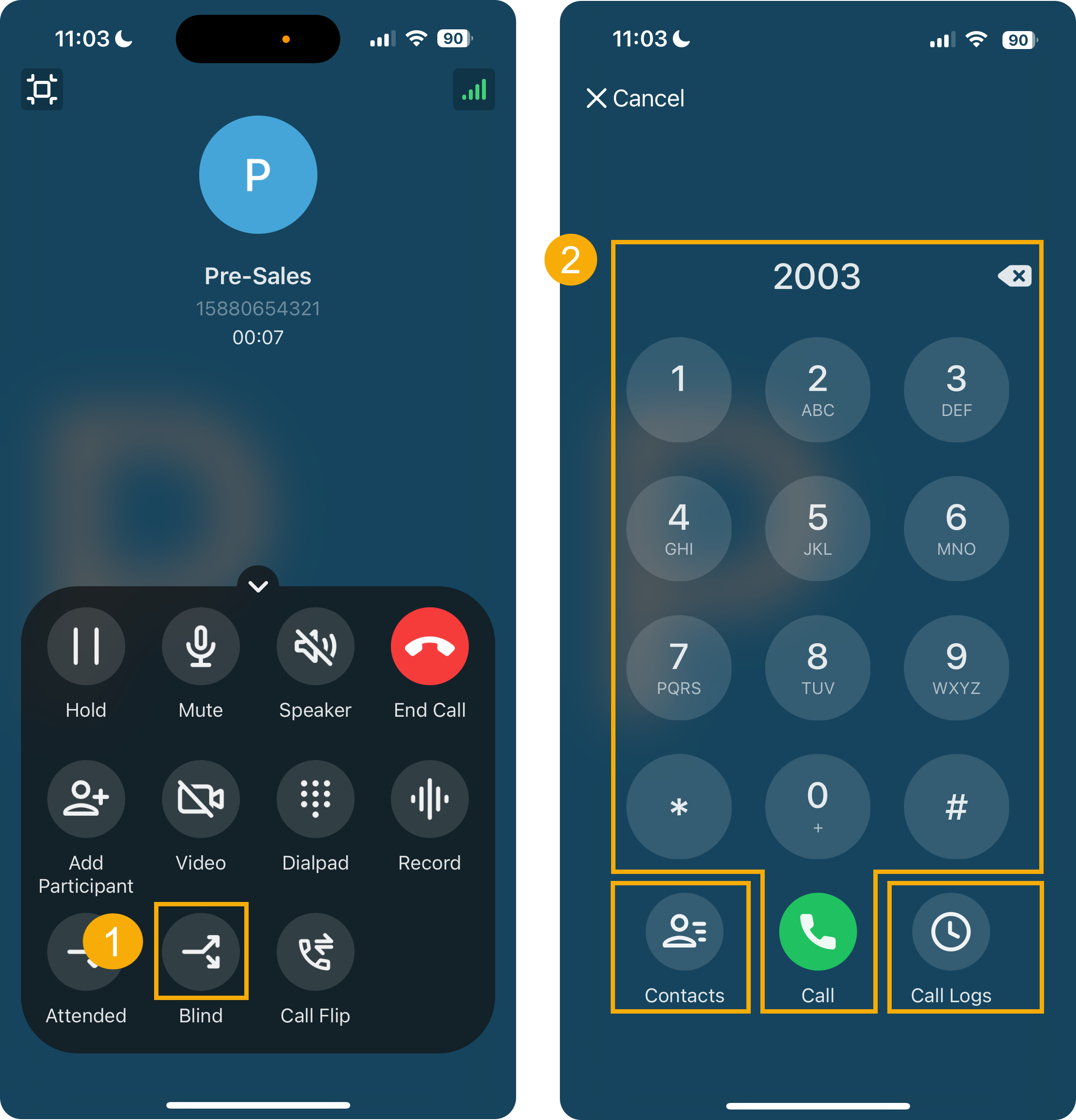 - Blind Transfer: Transfer an ongoing call to a third party immediately without giving him or her prior notification.