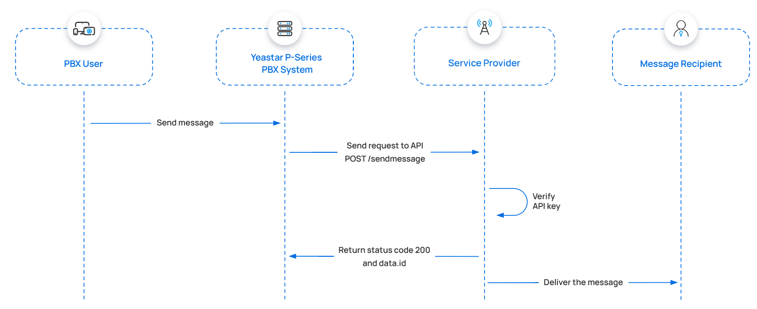 When a PBX user sends a message, PBX will send an API request to the Service Provider using the API interface for sending messages and API key, so as to deliver the message to external message recipient through Service Provider.
