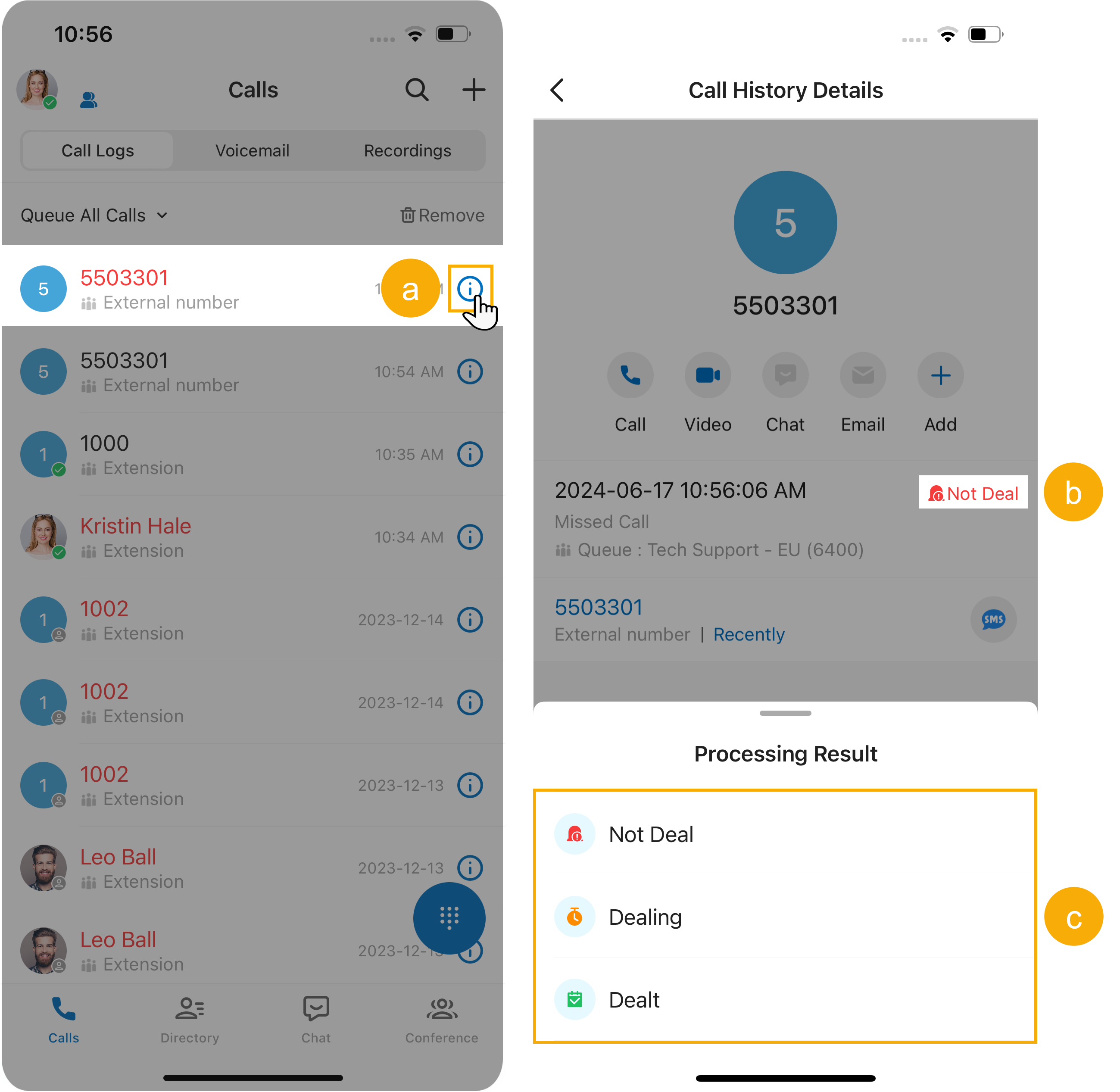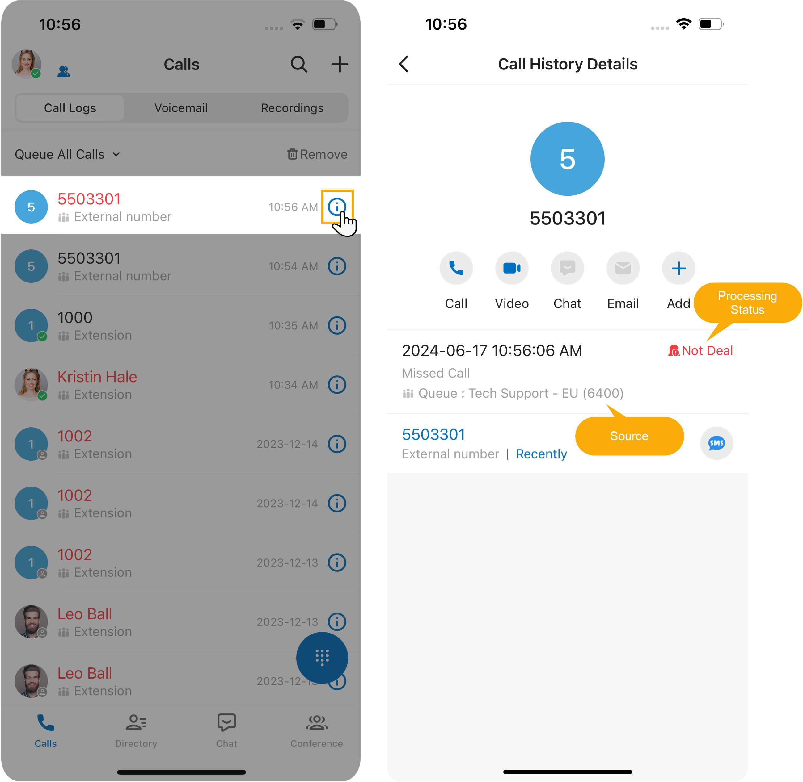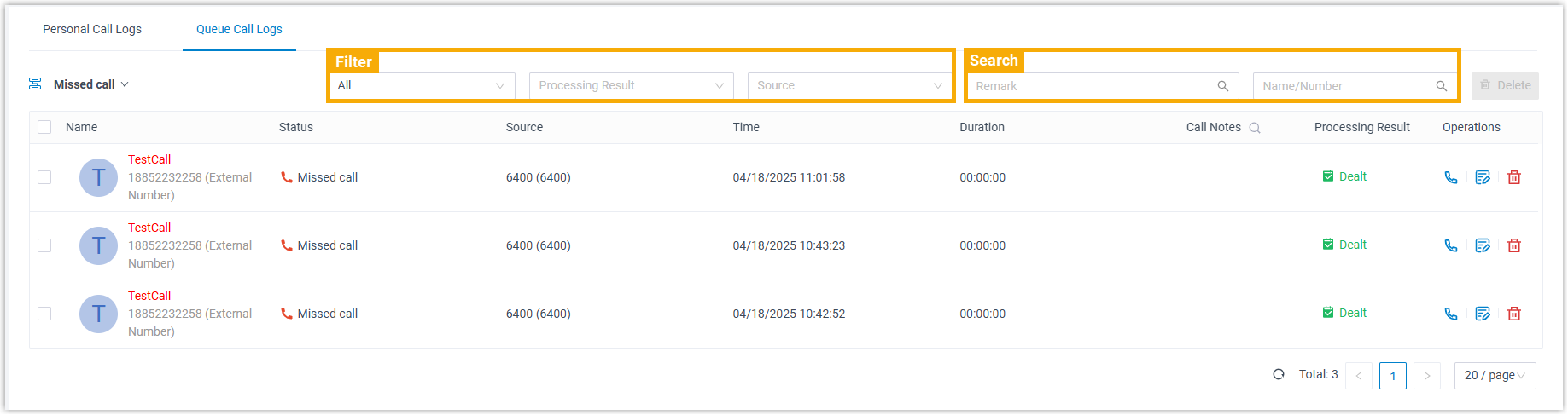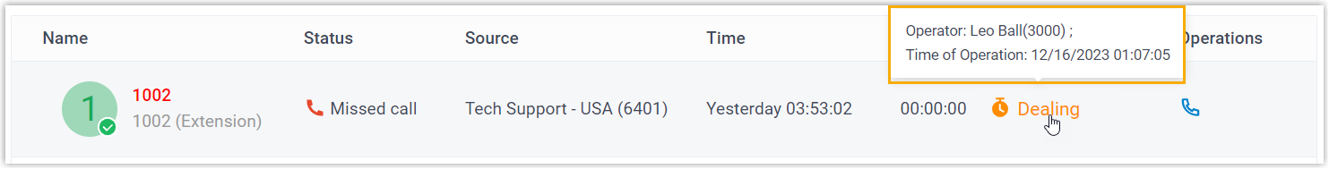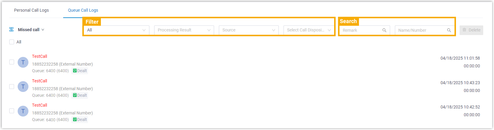 Check the details of queue call logs You can conveniently check the source of the queue call logs, as well as the processing status of missed queue calls.