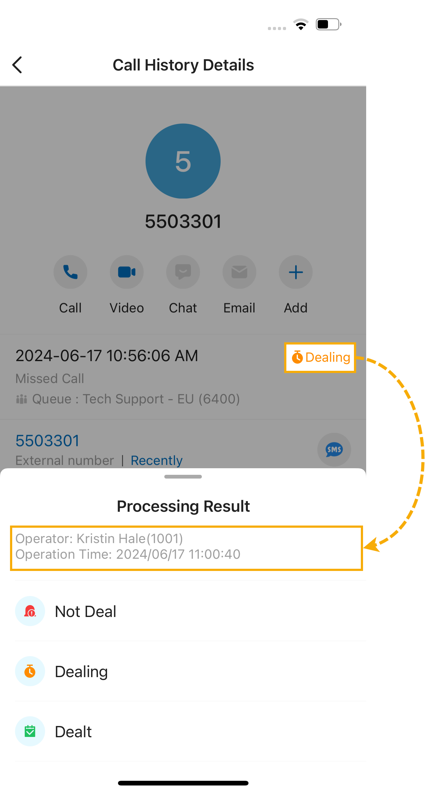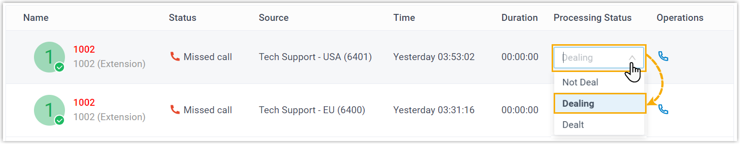 desired queue call log. - Tap the processing status beside the call log details.