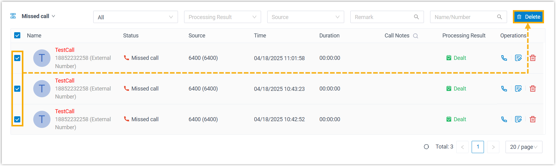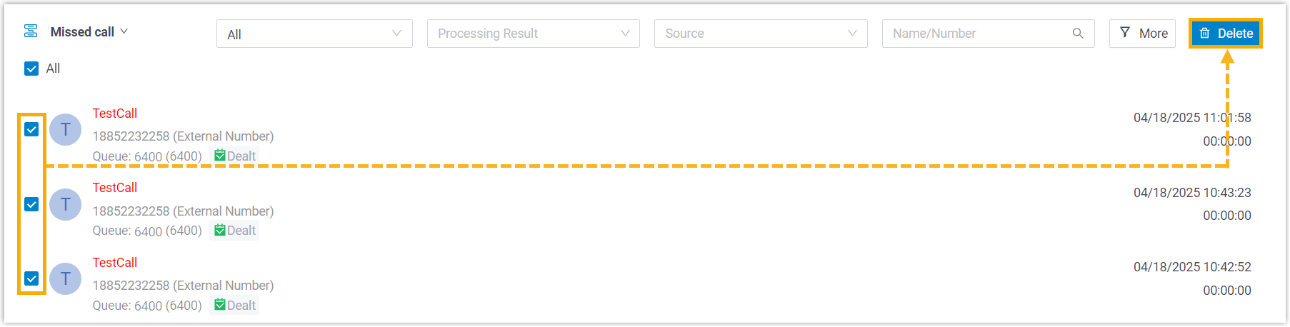 Operation Instruction Delete missed queue call logs You can delete missed queue call logs via the following methods: - To delete a single call log, click
