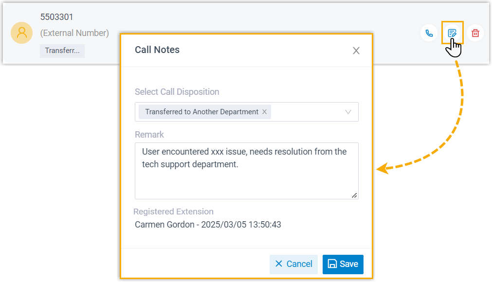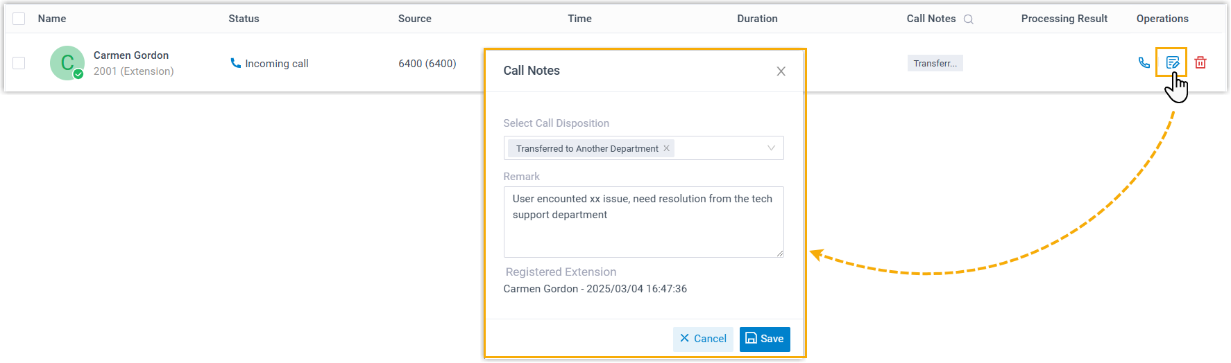 desired call log. - In the call note panel, edit the information as needed, then click Save.