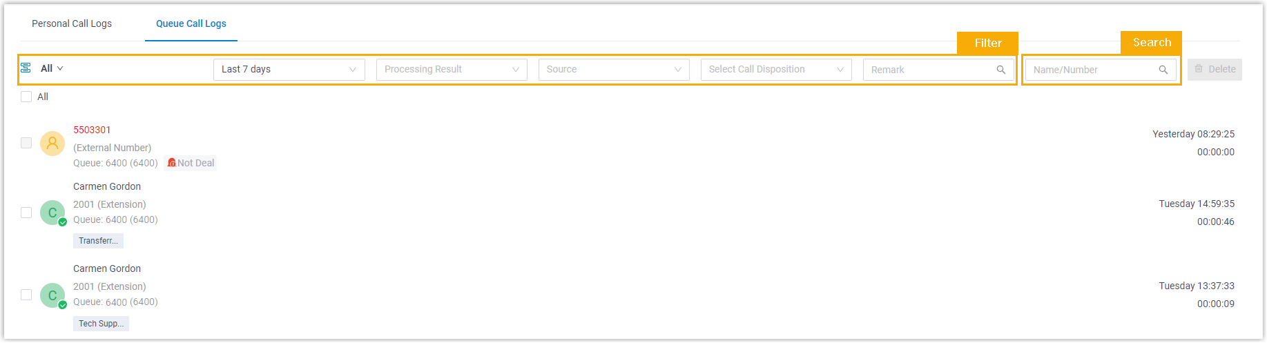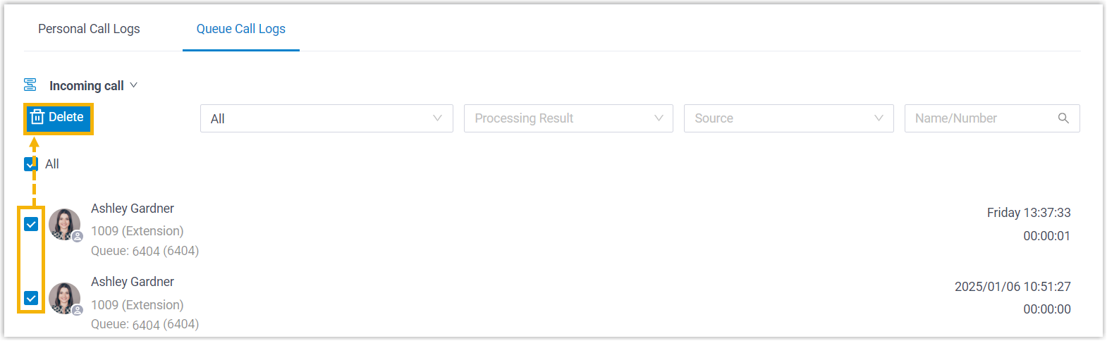 Delete incoming queue call logs Note: Only supports to delete the call logs of queue calls that you have answered.You can delete incoming queue call logs via the following methods:- To delete a single call log, click