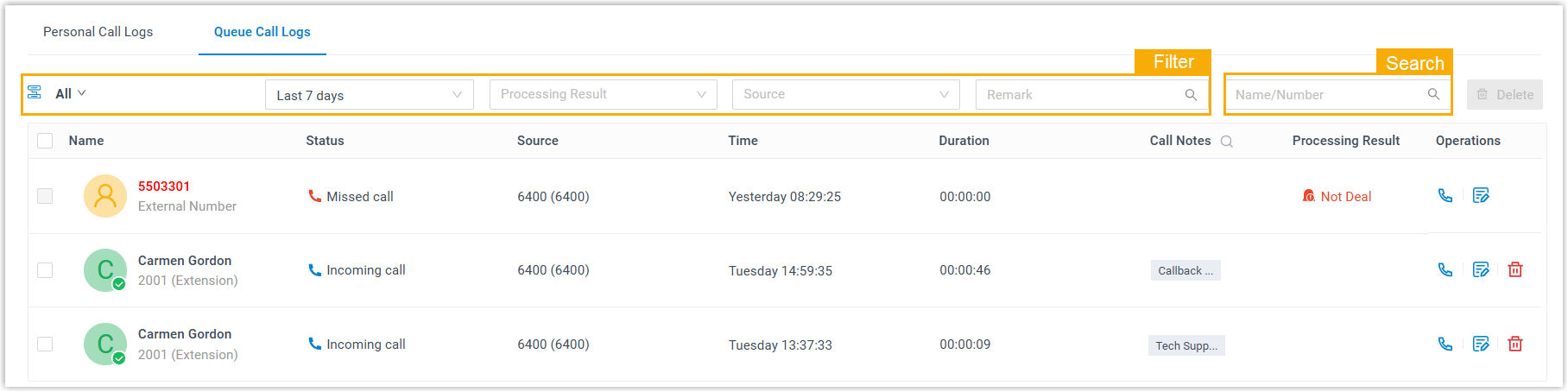 Operation Instruction Check the details of queue call logs You can conveniently check the source of the queue call logs, as well as the processing status of missed queue calls. Where Source indicates the queue the call came from, and Processing Status indicates the processing status of a missed queue call.-