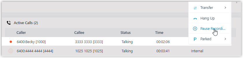 - To pause recording, right click the call, and click Pause