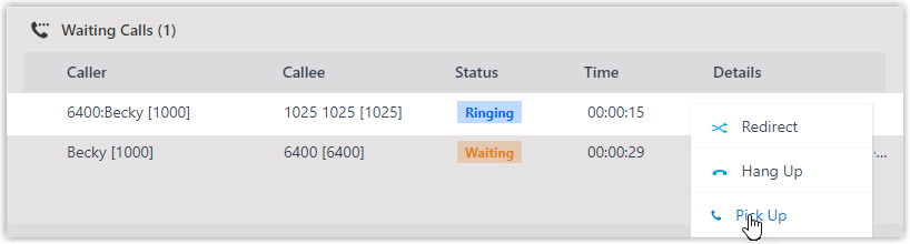 - On the Waiting Calls panel, hover your mouse over a call that is in Ringing status.