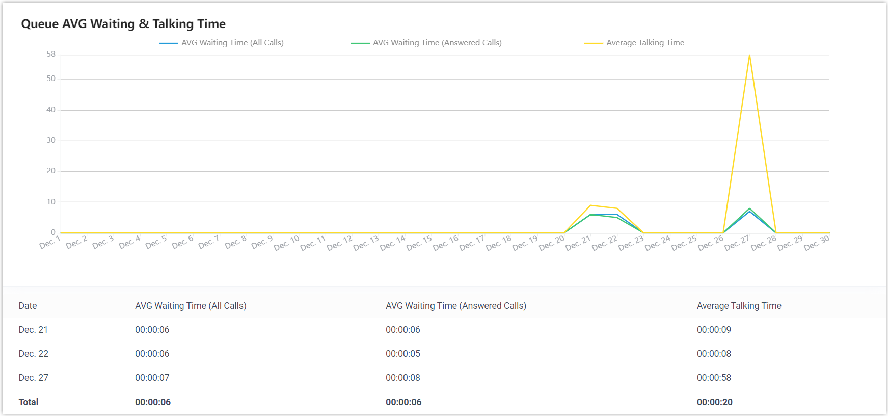 Queue AVG Waiting & Talking Time report provides granular insights into the hourly, daily, and monthly breakdown of the average amount of time that callers wait in a queue, and the average amount of time that queue agents spend in talking with callers. This topic introduces how to access the report and explains the key metrics in detail.