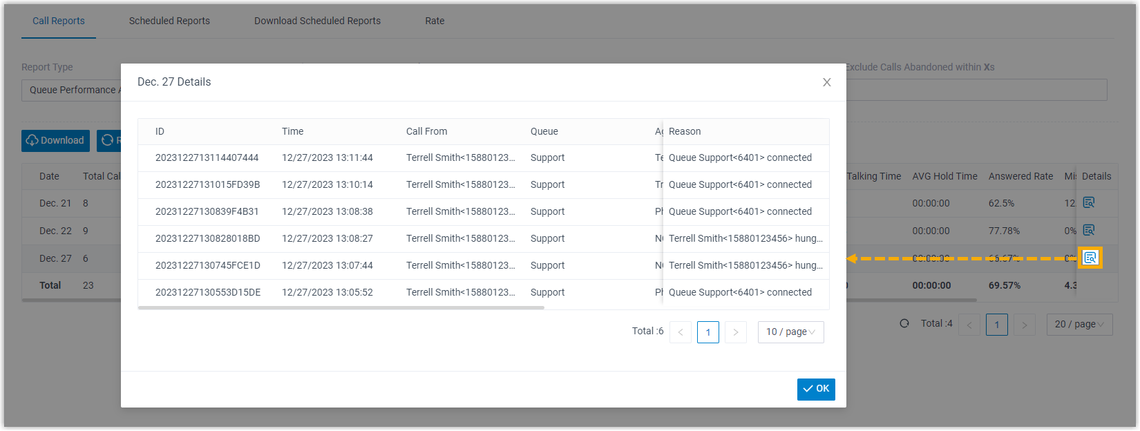 Metric Description ID A unique ID for the call. Time When the call was received. Call From The number and the name of the caller. Queue The queue that received the call. Agent The agent who answered the call. Note: If the call was not answered, None is displayed.Status Call status. - Answered