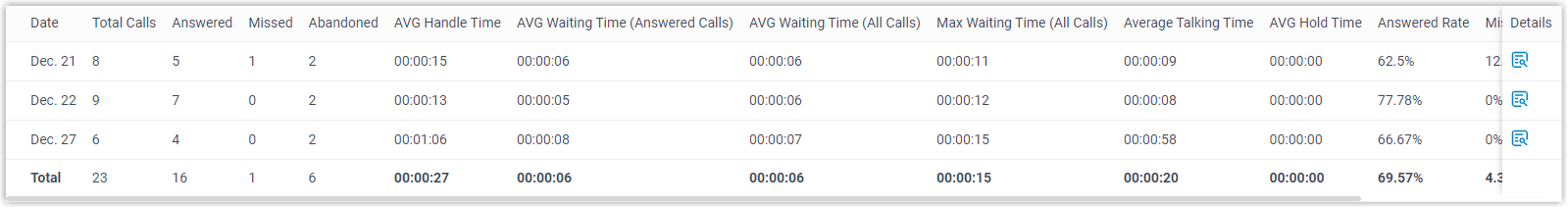 Missed Rate The percentage of missed calls in relation to the total received calls. Formula: (Total Missed Calls / Total Calls) * 100%