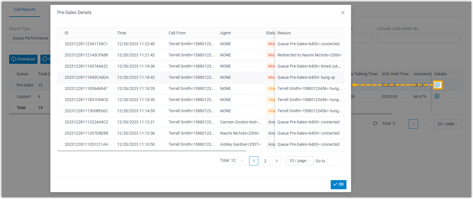 Metric Description ID A unique ID for the call. Time When the call was received. Call From The number and the name of the caller. Agent The agent who answered the call. Note: If the call was not answered, None is displayed.Status Call status. - Answered