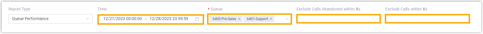 - To filter out abandoned short calls, specify the ring duration in the Exclude Calls Abandoned within Xs field. Calls abandoned within this time frame will NOT be included in the report.
