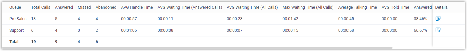 Max Waiting Time (All Calls) The maximum amount of time that callers waited in the queue, regardless of whether the calls were answered or not.