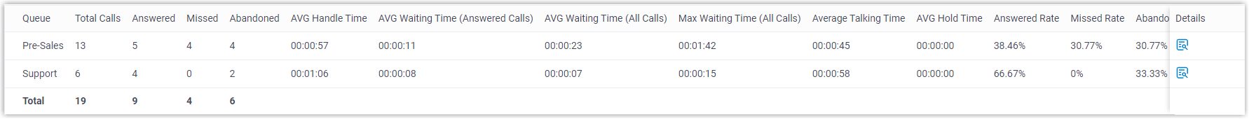 Missed Rate The percentage of missed calls in relation to the total received calls. Formula: (Total Missed Calls / Total Calls) * 100%