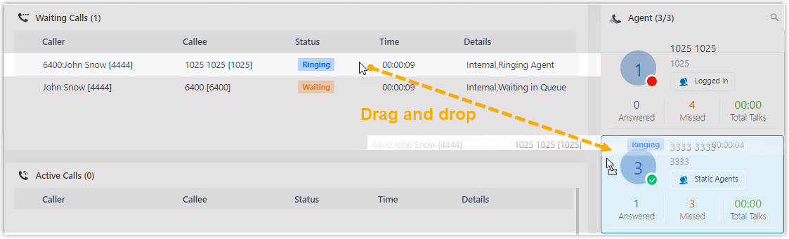 • Drag the call and drop it on a desired agent displayed in Agent panel.
