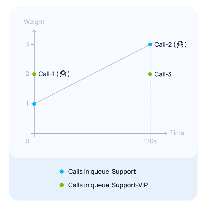 1 + (120 / 60) * 1 = 3.Since the queue weight of the Support (3) is now greater than that of Support - VIP (2), Call-2 will be answered first after the agent completes the ongoing call.