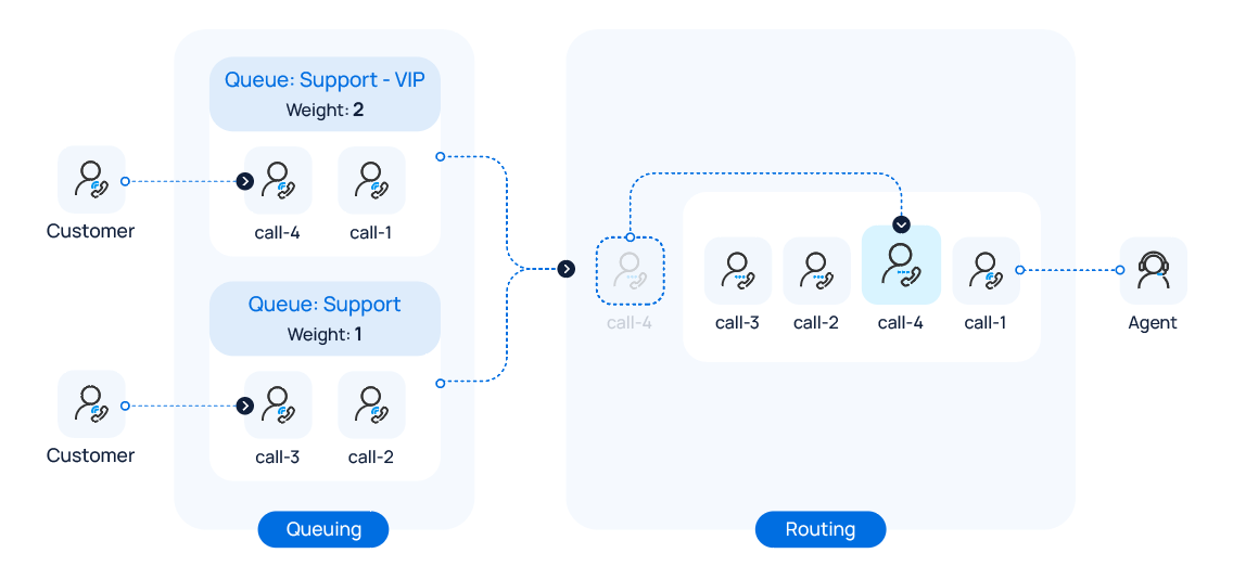 An agent simultaneously services for two queues (e.g. Support-VIP and Support), both of them have been assigned a weight. If there are incoming calls in both queues, the agent will first be connected to the calls coming from the higher-priority queue Support-VIP, ensuring that VIP callers receive a faster response.