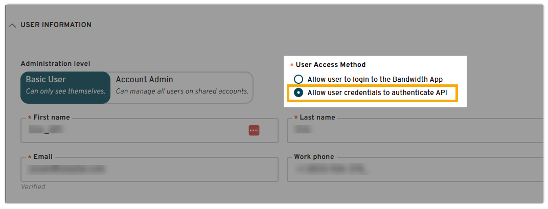 associated with your location in Bandwidth.Note: Ensure that the Allow user credentials to authenticate API option is enabled for the account.