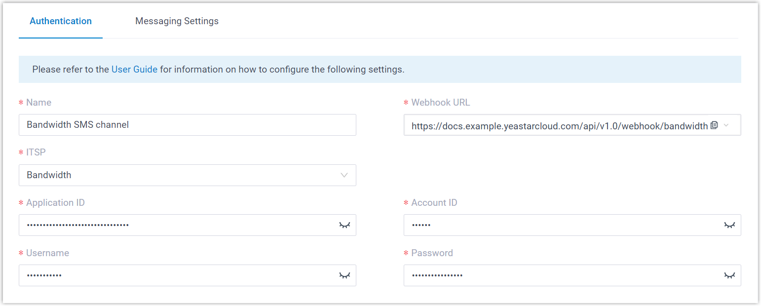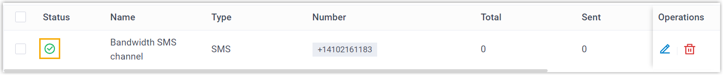 Create an SMS channel on PBX, and configure the channel with the authentication information and number obtained from Bandwidth.