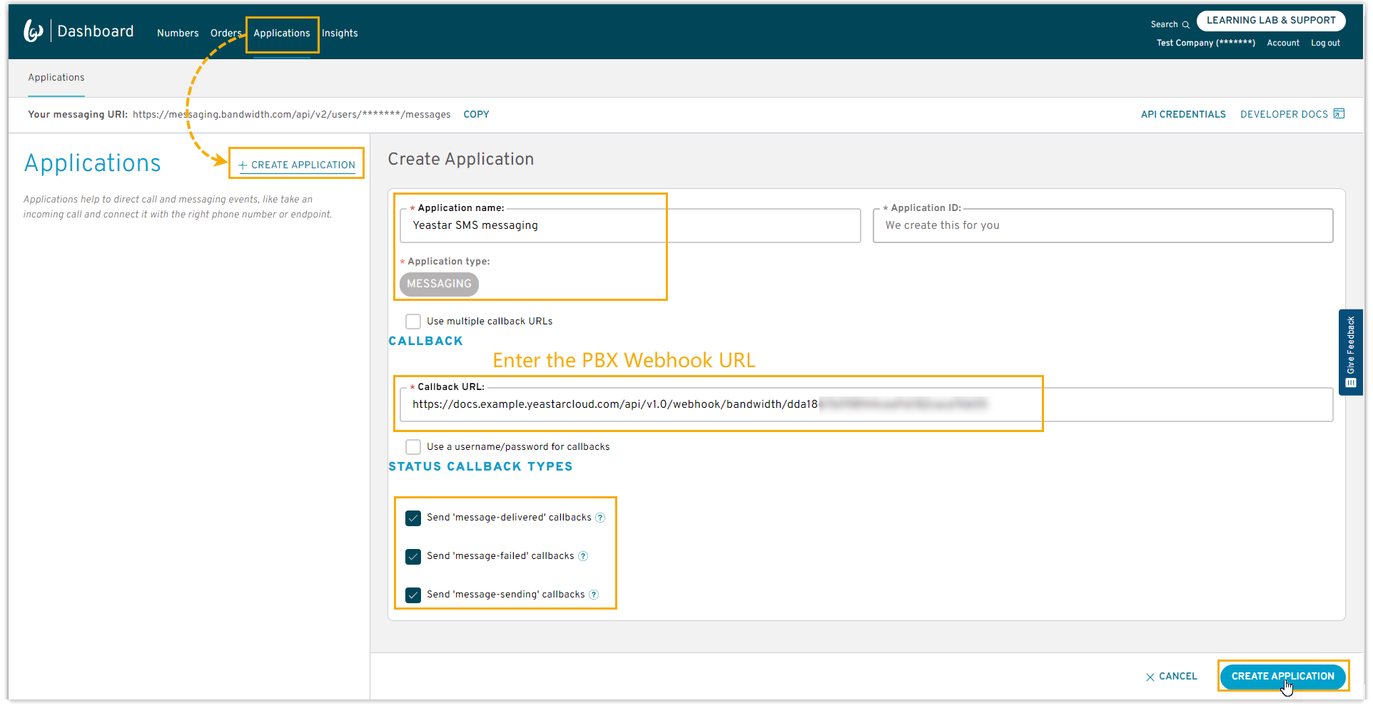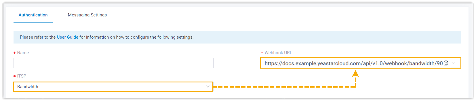 Obtain a Webhook URL from PBX web portal first, which is required when you configure a number for SMS on Bandwidth.