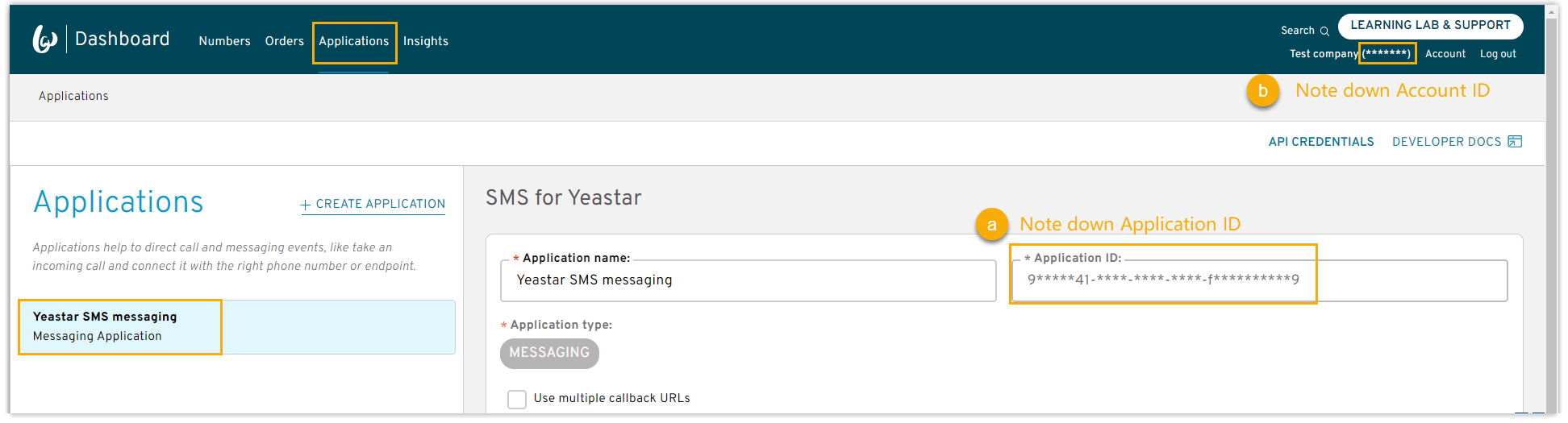 - Create an application using a sub-account and configure the callback with