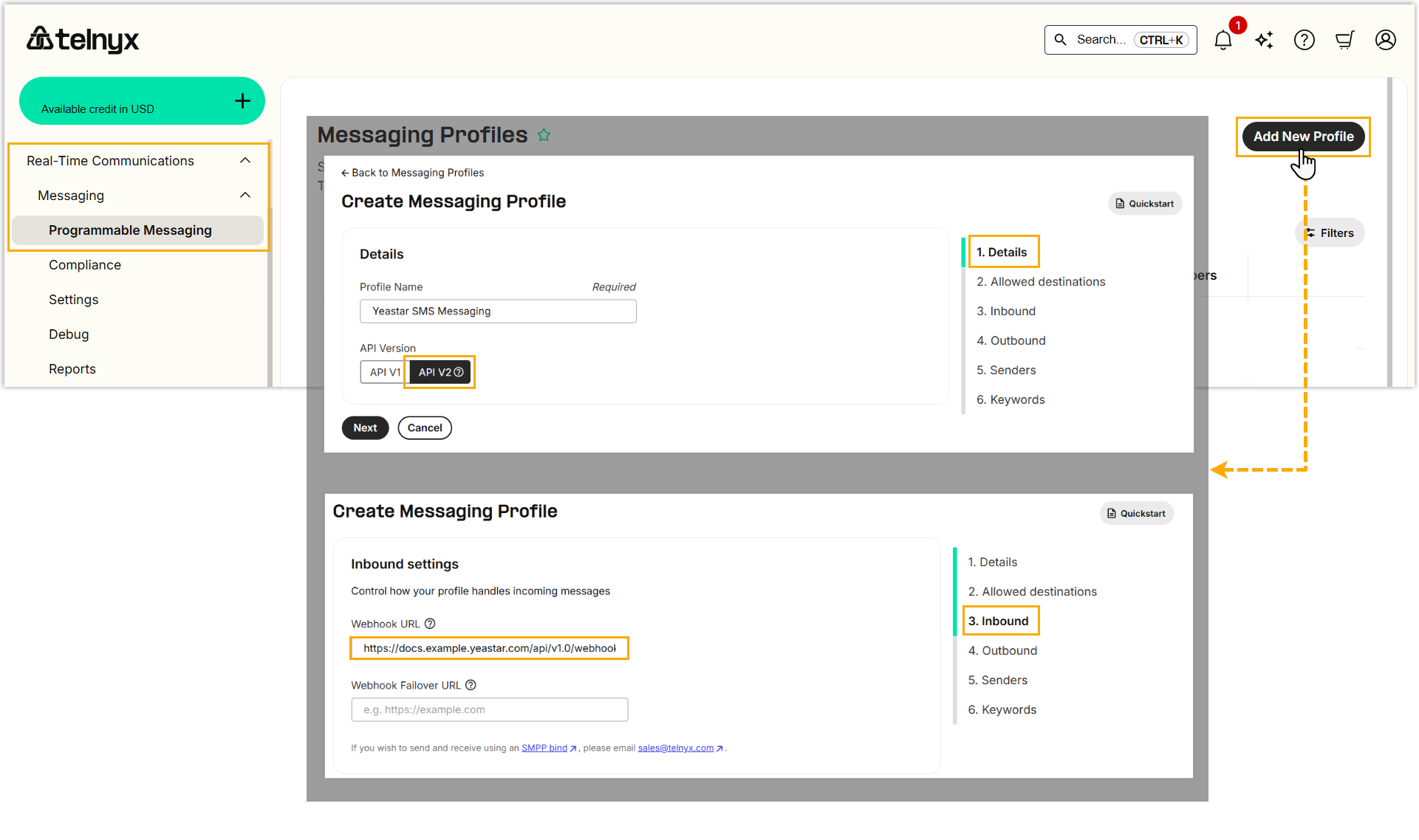 Obtain a Webhook URL from PBX web portal first, which is required when you configure a number for SMS on Telnyx.