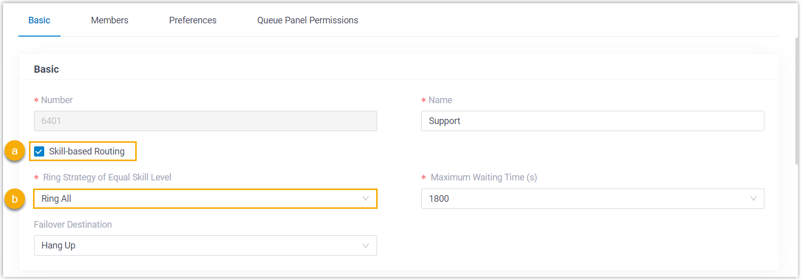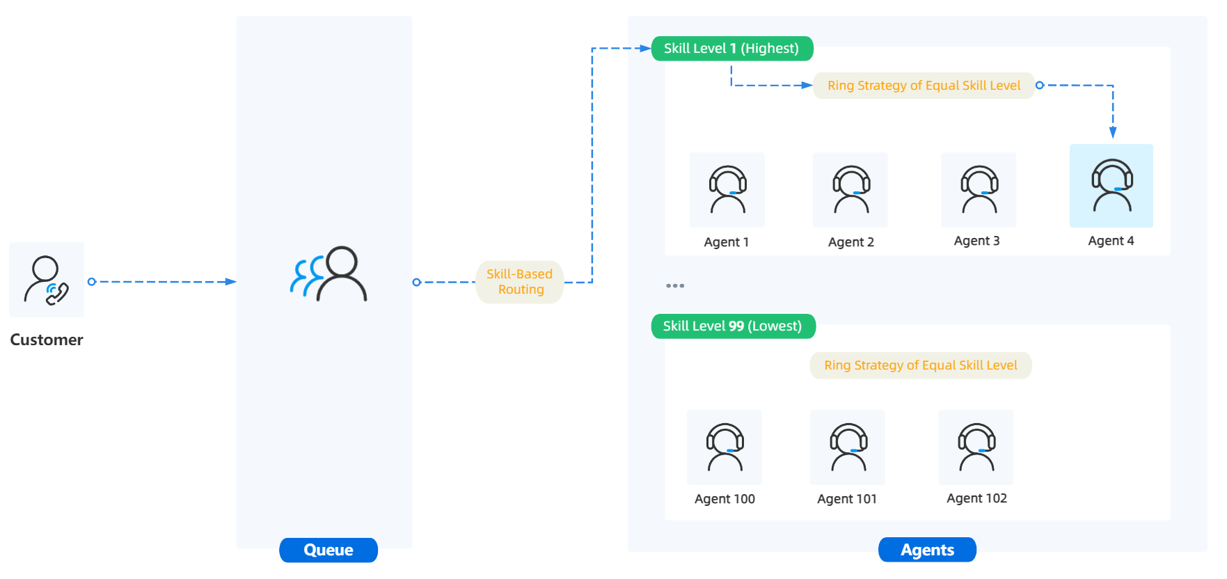 Skill-based routing supports specifying skill level for agents in a queue, and route calls to the designated agents in descending order of their skill levels. Prioritizing queue calls to the most skilled agents ensures properly handling of customer inquiries and enhanced work efficiency.