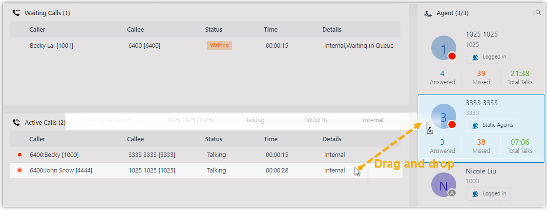 Drag the call and drop it on a desired extension displayed in Agents panel.