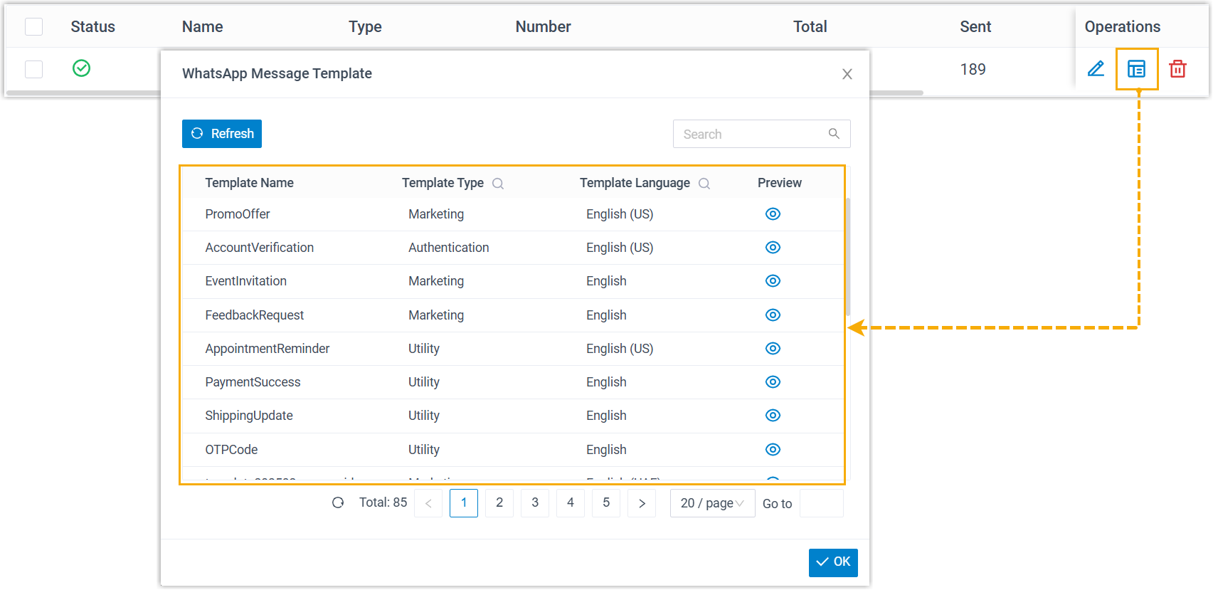 A window pops up, displaying all synchronized message templates associated with your WhatsApp Business Account.