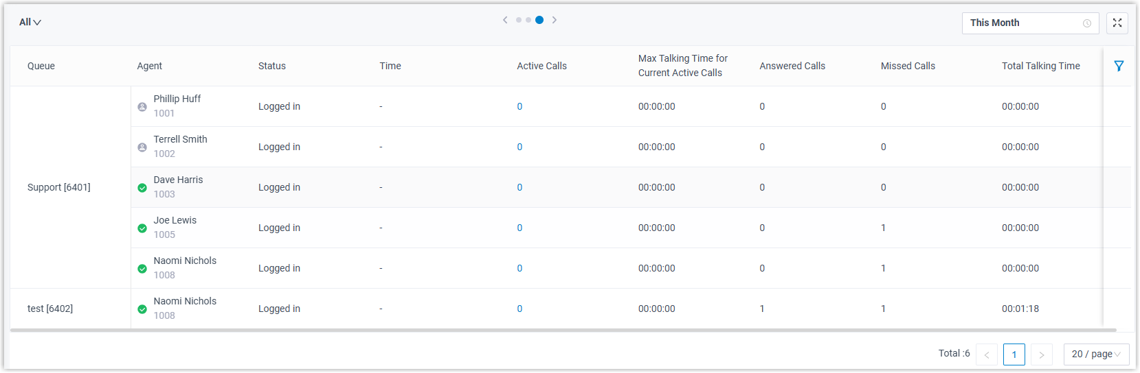 - Track agents' presence status, logged in/out status, call statistics, and more in a clear, organized list view.