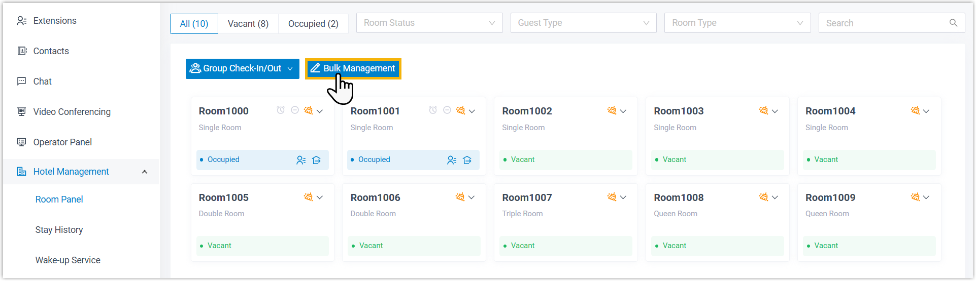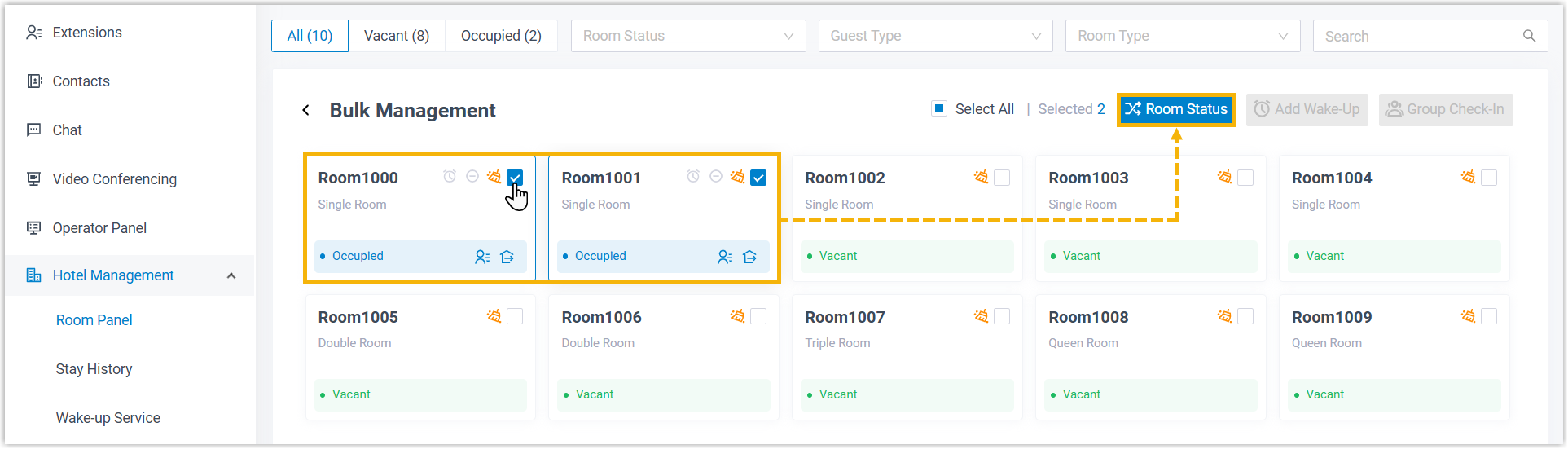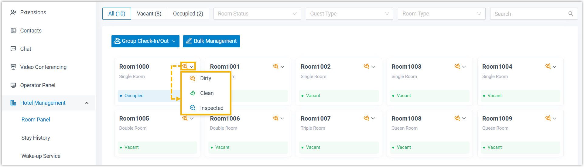 Cloud Voice supports two ways to change the status of guest rooms: