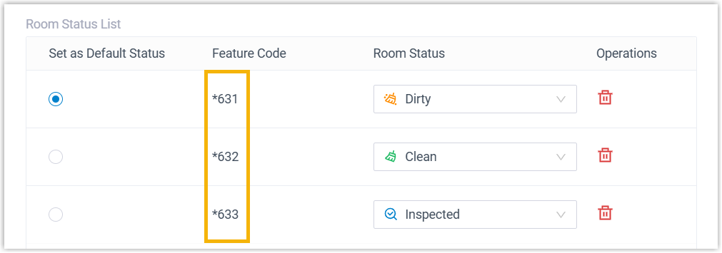 room status.Note: For the feature code, contact hotel manager, as the feature codes are automatically generated when hotel manager customizes the room status.