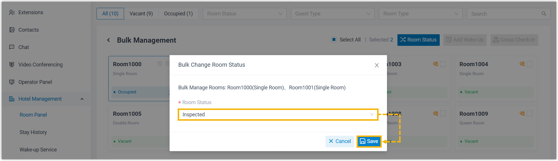 This topic describes how to change the status of guest rooms from Room Panel on Cloud Voice App Desktop/Web Client, so as to stay updated on rooms' condition.