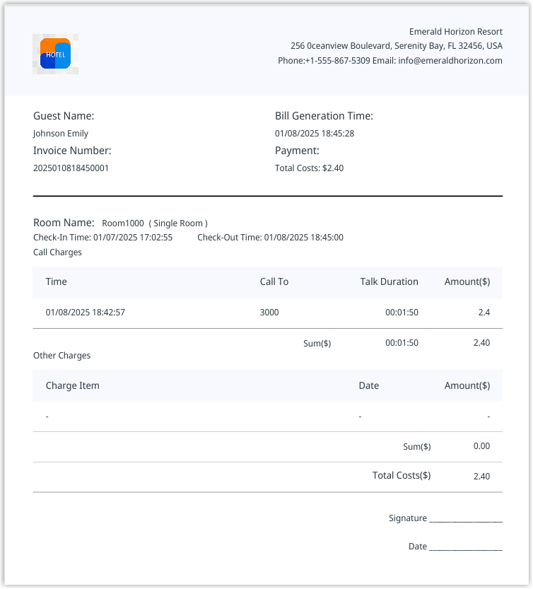 When guests check in to the hotel, a bill is created to track the charges incurred by the guests during their stay. Upon check-out, an invoice is generated and can be issued to guests. This topic describes how front desk can check guest bills and invoices.