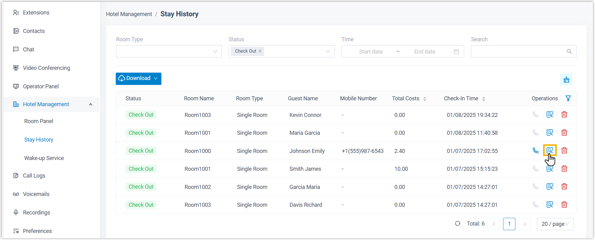 When a guest checks out, you can access the guest's invoice from Stay History panel and provide it to the guest.