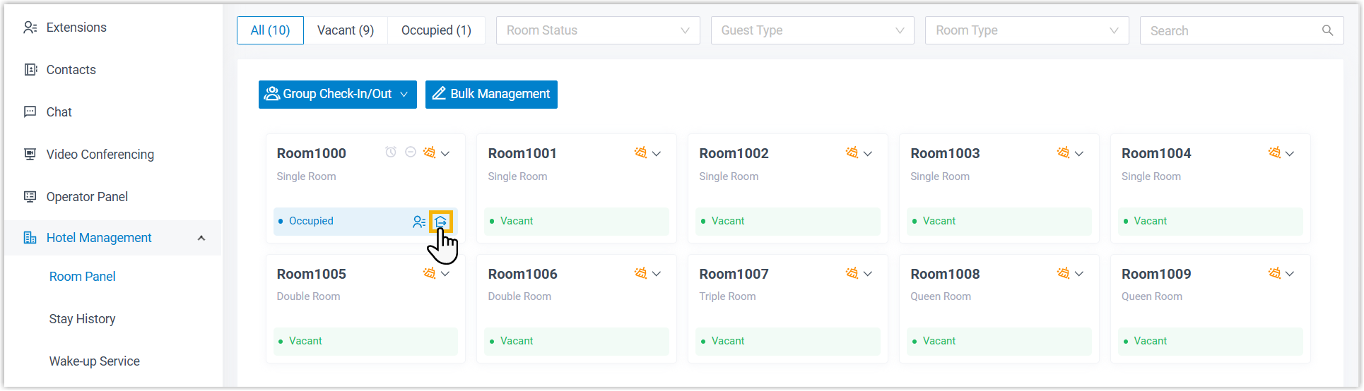 - The guest room is marked as Vacant and its status is reset to the default setting.