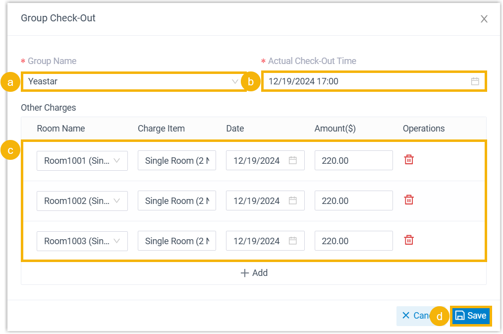 - In the Actual Check-Out Time drop-down list, keep the current time as the check-out time, or change it as needed.