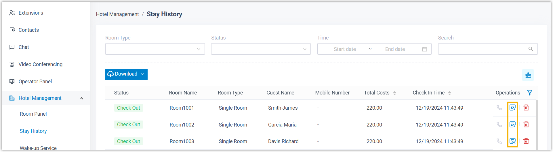 - At the bottom-right corner of a checked-in room, click