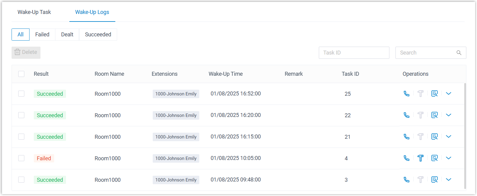 Each time a wake-up task is executed, the activity will be logged for tracking purposes. In the event that a wake-up task fails, front desk can review the log for details.