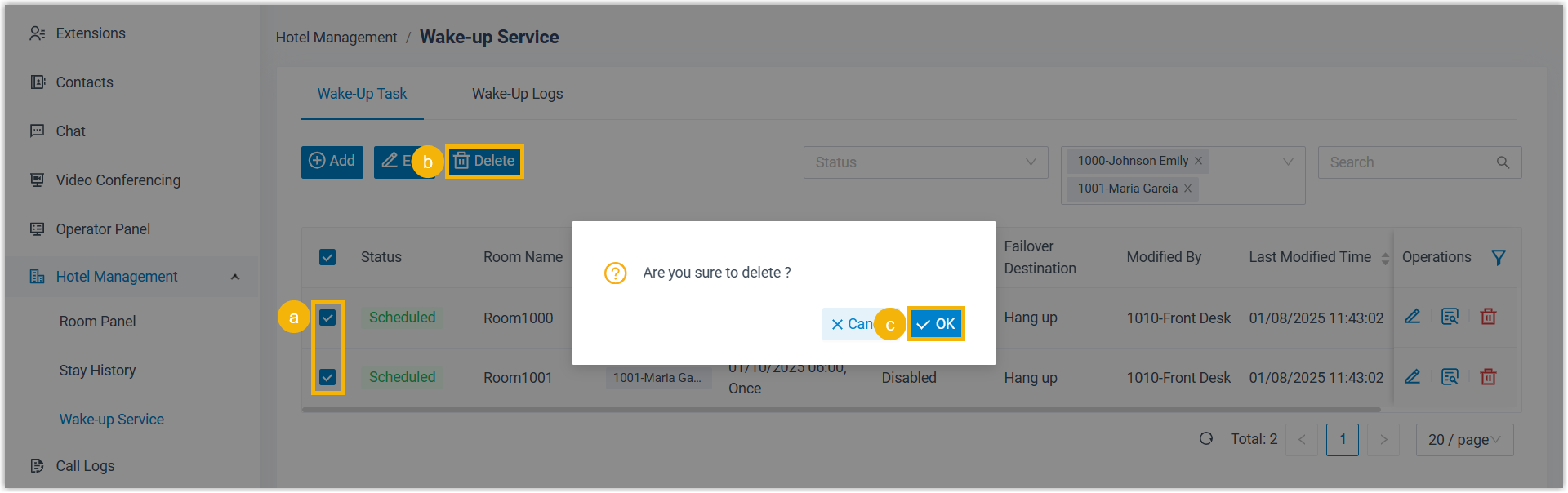 If guests need to cancel alarms, front desk can delete wake-up calls on Cloud Voice App Desktop/Web Client. Alternatively, guests can delete their own wake-up calls from their room phones.