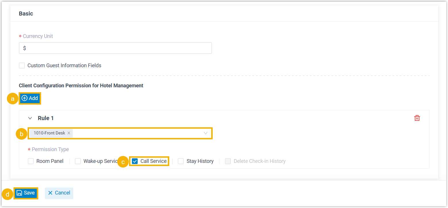 By default, all room extensions are assigned the User user type, and no one can manage guest calls. You can designate specific staff members (e.g. front desk) as the Manager by granting them the call service permission , who will then be able to manage guest calls from Cloud Voice App Desktop/Web Client.