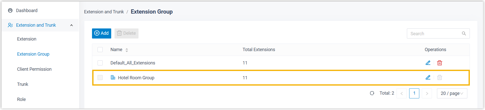 Cloud Voice implements group-based control over users' call management permissions. After you enable hotel management on PBX, an extension group Hotel Room Group is automatically created, and all extensions assigned to guest rooms will be added to the group.