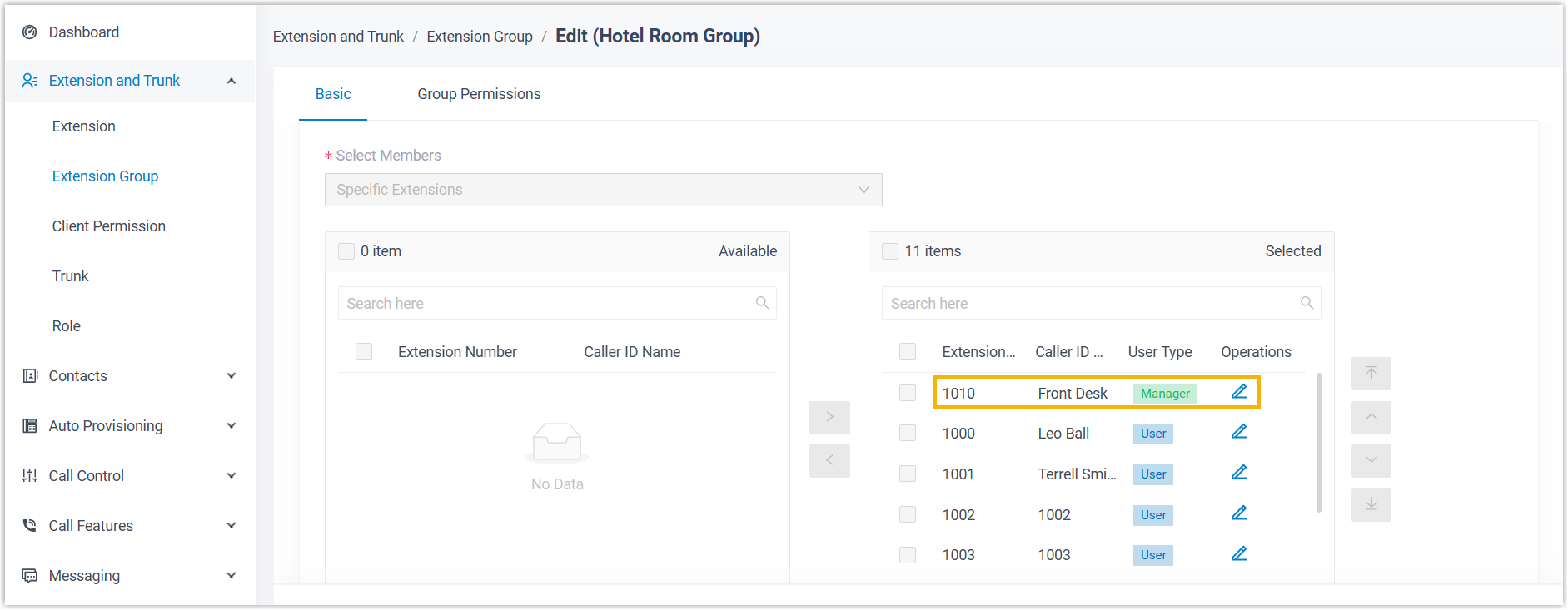 The selected extension(s) become the manager of the hotel extension group and can manage calls on Cloud Voice App Desktop/Web Client.