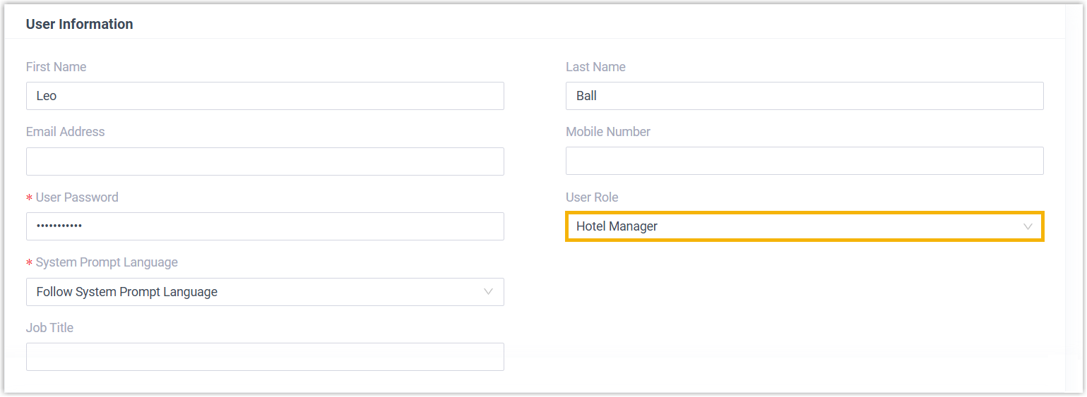 Cloud Voice has a built-in role Hotel Manager with exclusive access to manage the hotel service. To enable colleagues to co-manage the hotel service, you can assign the role to the desired extension user(s).