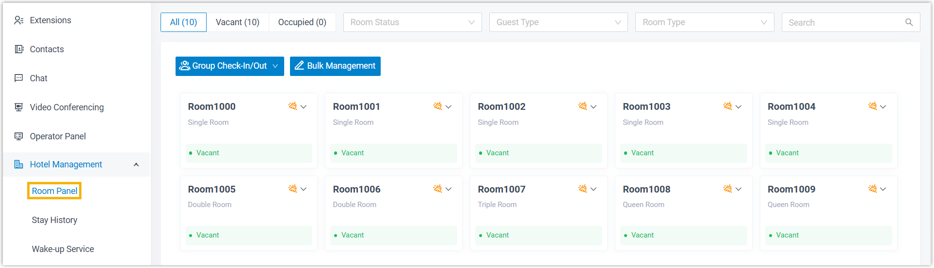 Grant room management permission to front desk(s), allowing them to handle guest check-ins and check-outs, room assignments, wake-up calls and more, directly from Cloud Voice App Desktop/Web Client.