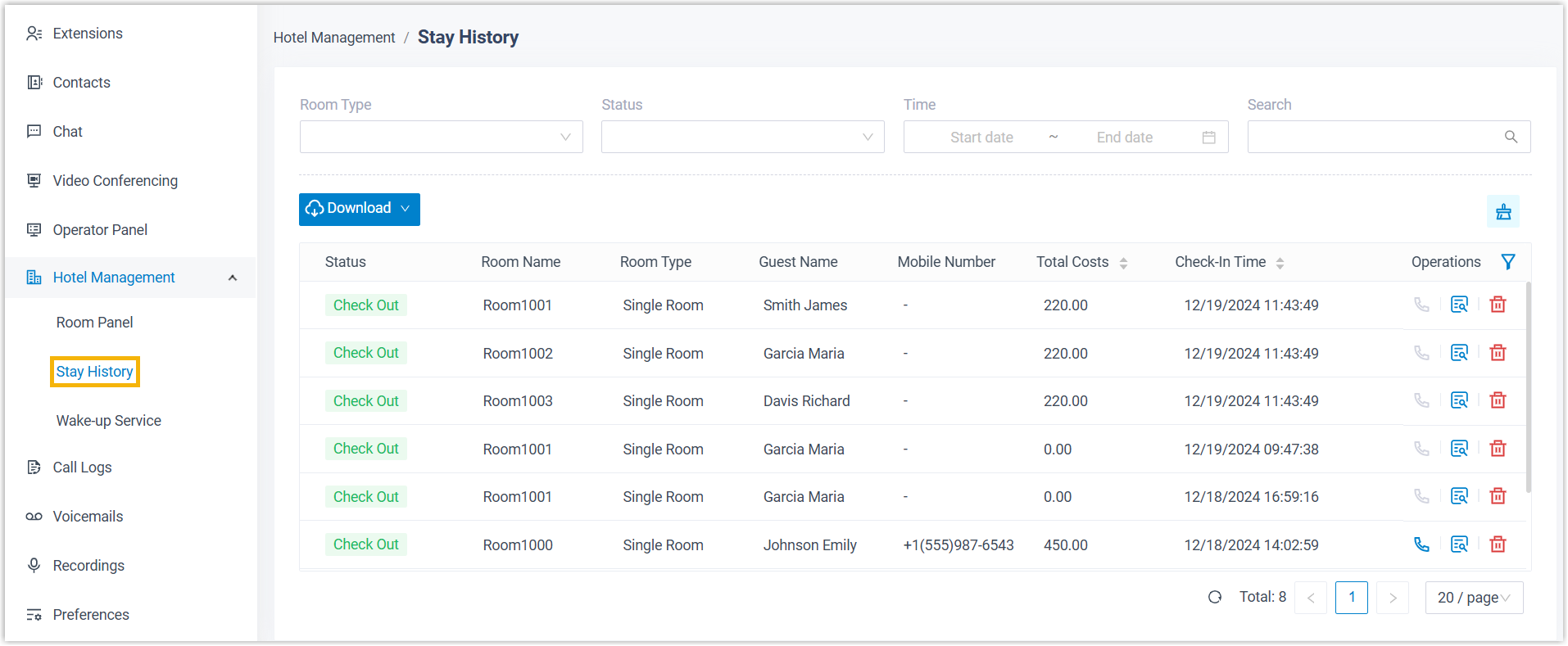 Stay History The authorized staff member can access Stay History on Cloud Voice App Desktop/Web Client (Path: ) to review guest stay history.