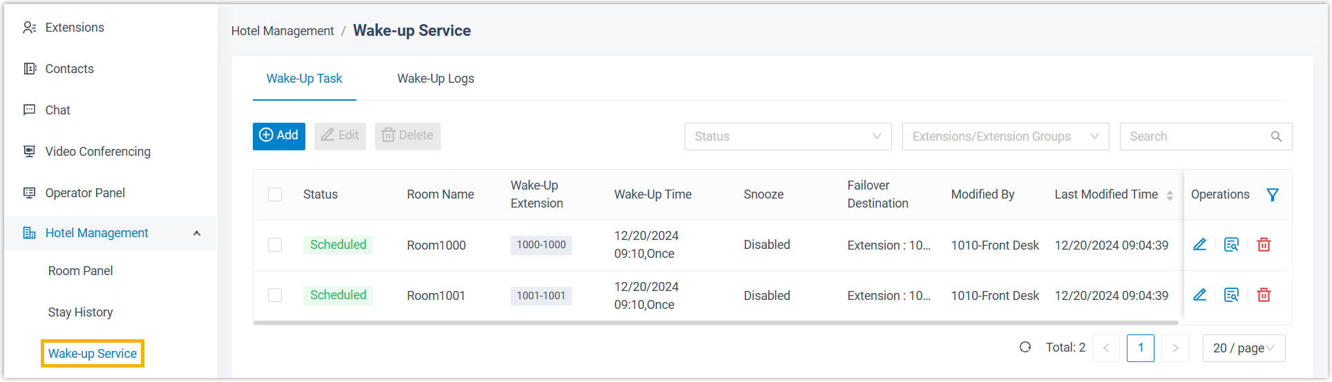 Wake-up Service The authorized staff member can access Wake-up Service (Path: ) on Cloud Voice App Desktop/Web Client to perform operations such as schedule wake-up tasks and review the wake-up log.