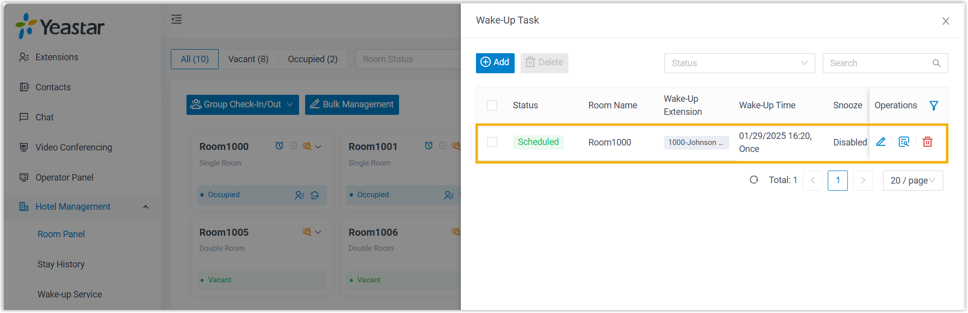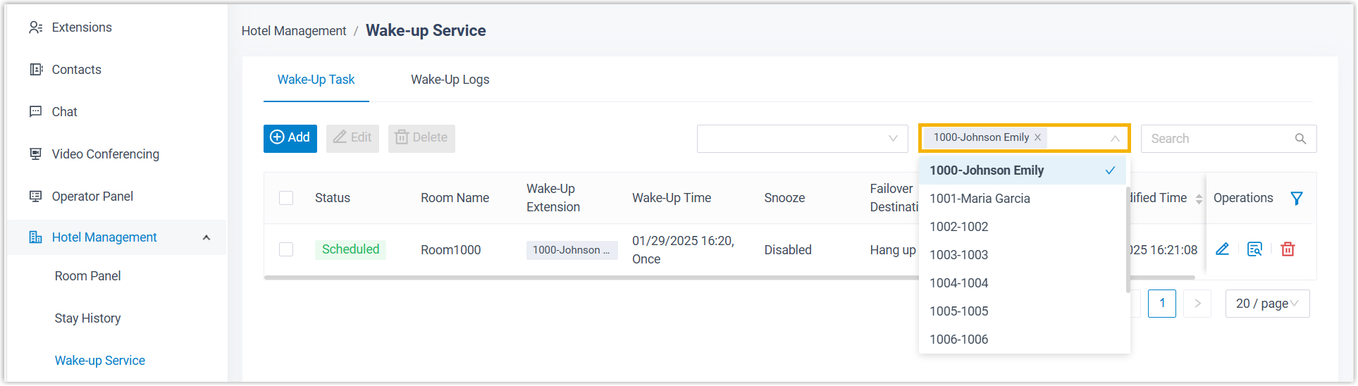 In case of need, front desk can query the scheduled wake-up calls for guests on Cloud Voice App Desktop/Web Client. Alternatively, guests can query their own scheduled wake-up calls from their room phones.